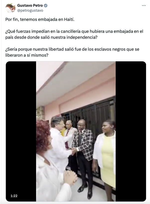 El fin de semana, Petro inauguró la innecesaria embajada de Colombia en Haití. En vez de celebrar con el tono que debe emplear un hombre de Estado, se valió de la oportunidad para ajustar cuentas y pelear con los fantasmas que rondan su atormentada y adicta imaginación. En la red social X, se preguntó: «¿Qué fuerzas impedían en la cancillería que hubiera una embajada en el país desde donde salió nuestra independencia? ¿Sería porque nuestra libertad salió fue de los esclavos negros que se liberaron a sí mismos?».