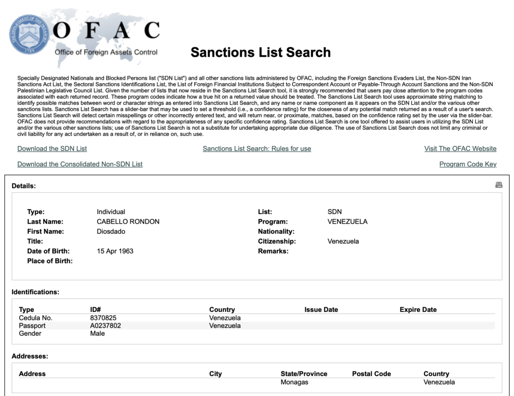 En mayo de 2018, la Oficina de Control de Activos –OFAC– lo incluyó en la lista de «personas designadas». Su hijo, su esposa y algunos de sus compinches también entraron en esa innoble categoría que, como se ha visto, se traduce en una suerte de muerte civil